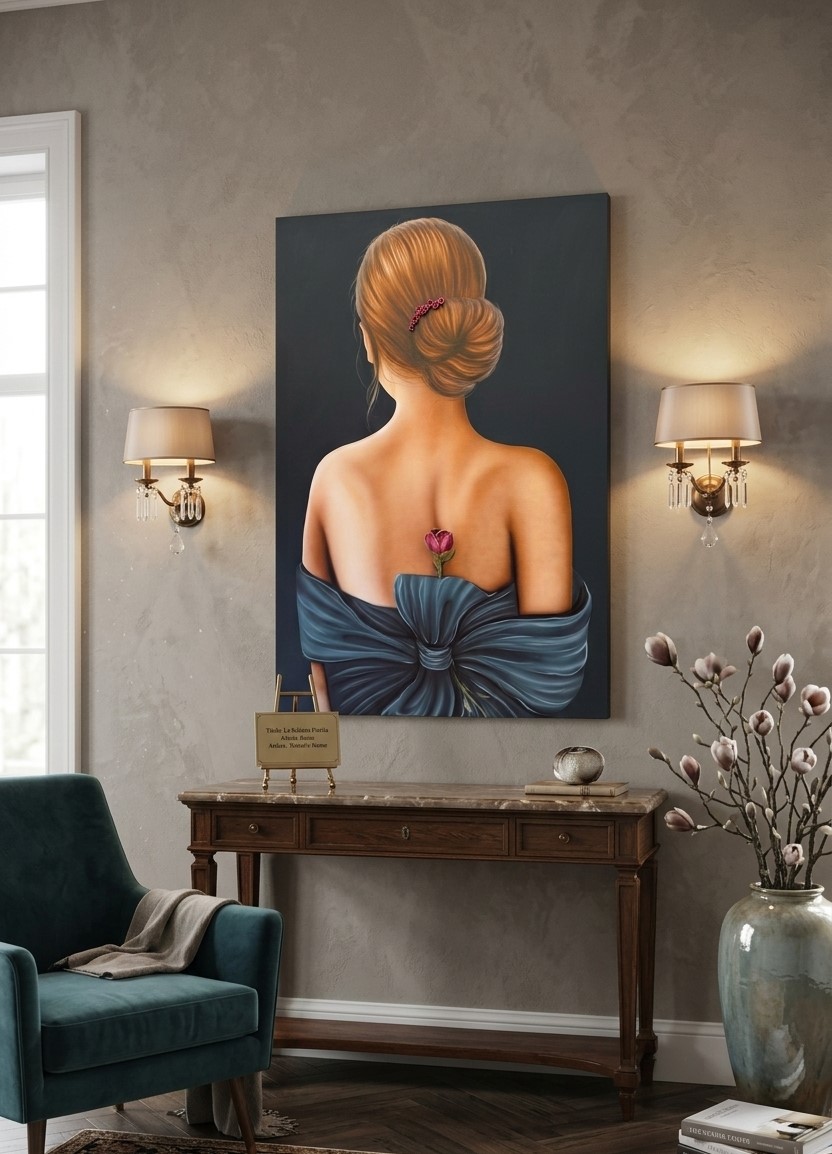 La scena ritrae una figura femminile di spalle, immersa in una raffinata aura di eleganza e mistero. I capelli raccolti in uno chignon perfetto, adornato da un delicato fermaglio di rose color rubino, rivelano una cura per il dettaglio che è puro virtuosismo artistico. Ma è la simbologia della rosa che sboccia tra le scapole, emergendo da un nastro sontuoso in tessuto blu notte, a dare profondità emotiva all’opera: un fiore che nasce dalla pelle, come se la bellezza fosse parte essenziale e inseparabile dell’essere.