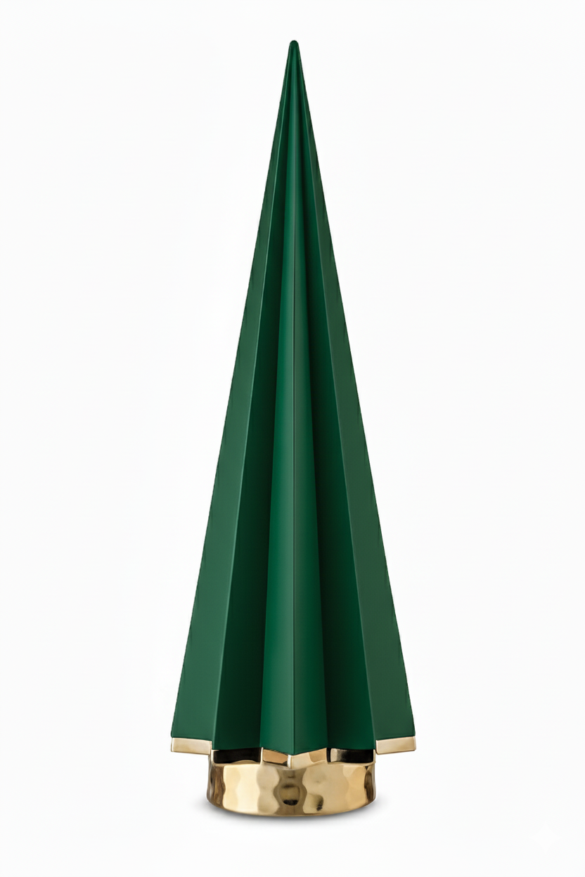 Porta la magia delle feste in casa con l’esclusivo albero di Natale Bongelli. Il suo design raffinato, dalle linee geometriche e slanciate, è impreziosito da una finitura verde intenso e da una solida base martellata in metallo dorato che dona luce e prestigio a qualsiasi ambiente. Perfetto come centrotavola o complemento d’arredo, questo albero unisce tradizione e modernità, creando un’atmosfera festosa e sofisticata.