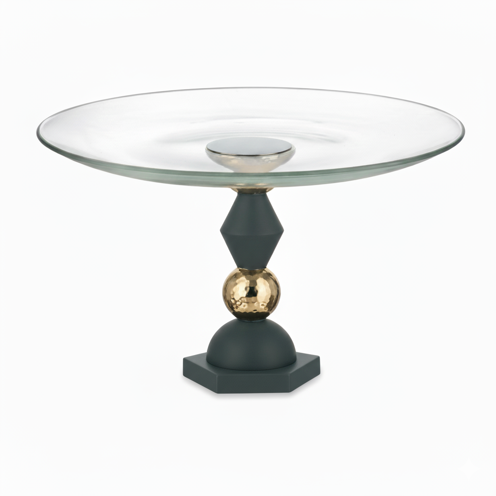 La sommità è coronata da un ampio piatto in vetro trasparente, ideale per esporre frutta fresca, dolci prelibati o composizioni floreali, trasformando ogni occasione in un’esperienza visiva indimenticabile.