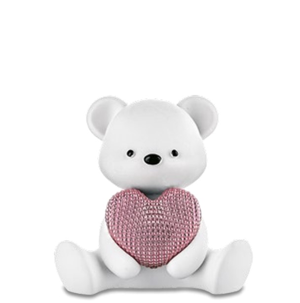 Questo adorabile orsetto, realizzato con cura in resina bianca opaca, stringe tra le sue zampine un cuore scintillante color rosa, illuminando di dolcezza ogni sguardo. ร la bomboniera ideale per: