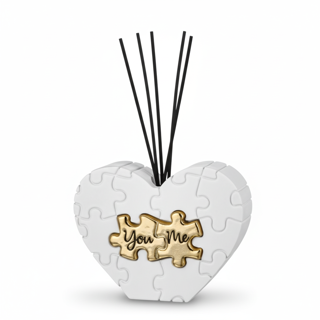 Design Romantico, Fragranza Avvolgente: Questo adorabile profumatore si presenta a forma di cuore, composto da tessere puzzle in una candida finitura bianca opaca, che conferisce un’eleganza discreta e moderna. Al centro, due tessere puzzle dorate si incastrano perfettamente, portando le dolci parole “You” e “Me” finemente incise. Questo dettaglio dorato non solo aggiunge un tocco di lusso, ma enfatizza il messaggio di unione e completamento tra due persone. Gli eleganti bastoncini neri, che si ergono armoniosamente dalla parte superiore del cuore, diffondono delicatamente la fragranza prescelta in ogni angolo della tua casa.