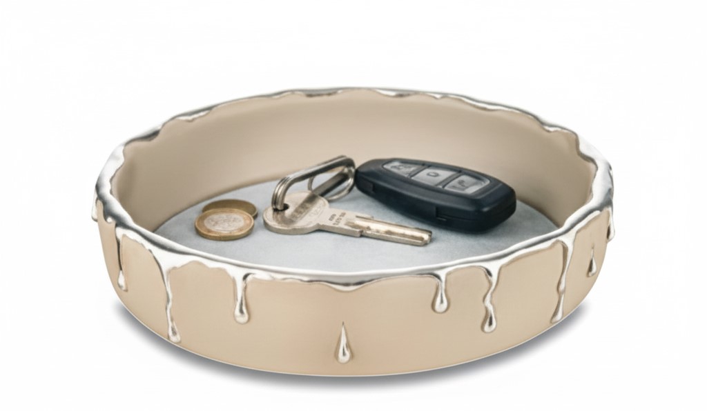 La sua forma circolare e armoniosa, in una calda tonalitร neutra, รจ impreziosita da una finitura esterna che simula gocce d’argento o d’oro (a seconda della variante) che sembrano sciogliersi elegantemente lungo il bordo. Questo dettaglio unico cattura la luce e aggiunge profonditร , trasformando un oggetto funzionale in un pezzo d’arte decorativa.