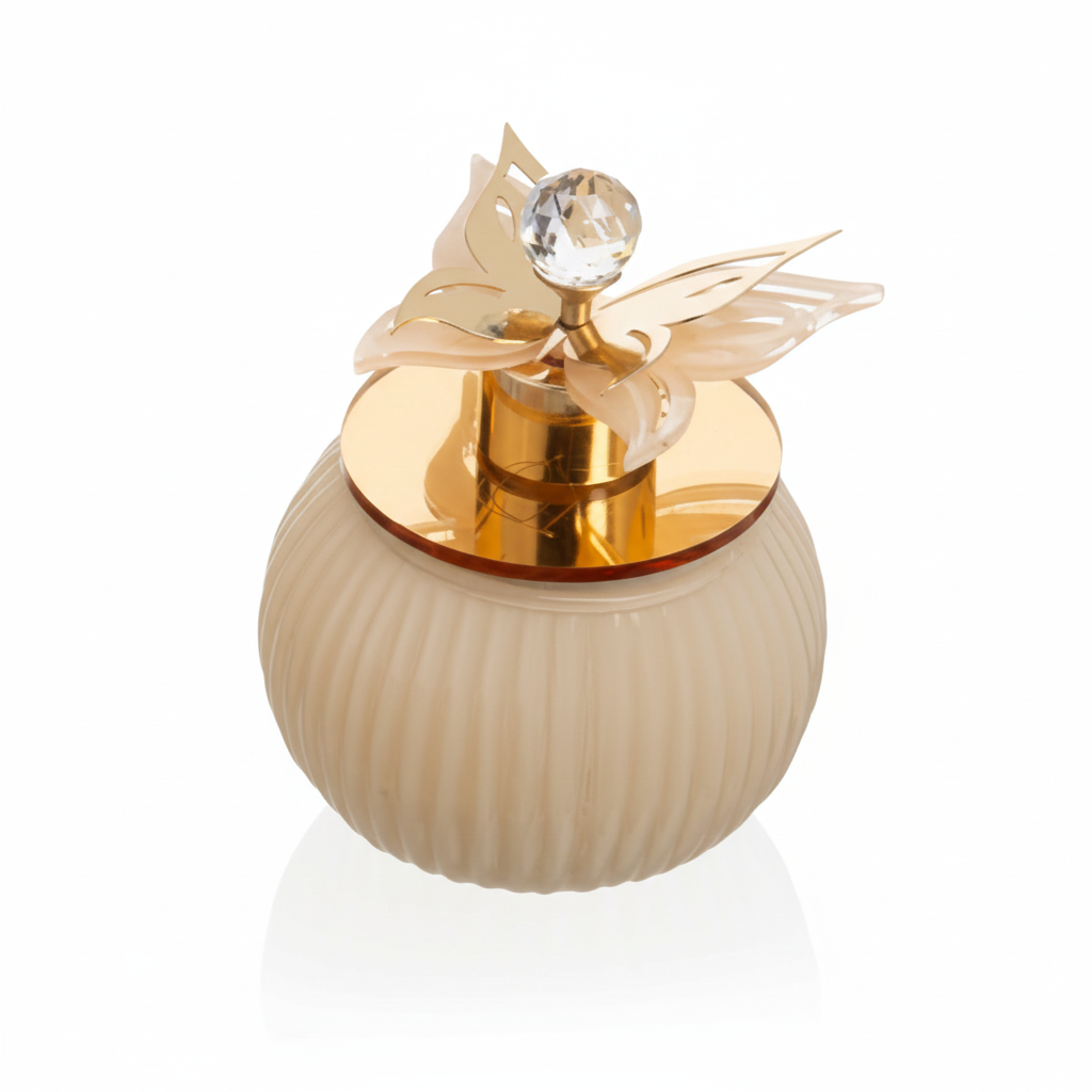 Con le sue eleganti scanalature verticali e il delicato color avorio, questa candela si presenta in una forma sferica affascinante, coronata da un coperchio dorato che sorregge un bouquet di petali stilizzati e un cristallo brillante, simile a una goccia di rugiada. Ogni dettaglio รจ pensato per incantare e decorare con grazia.