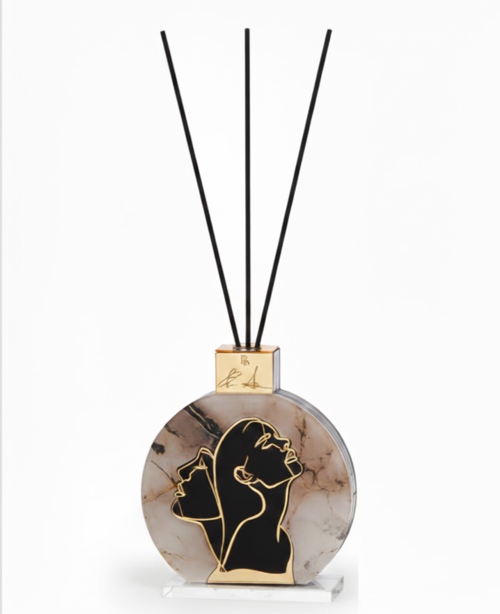 Design Unico e Dettagli Preziosi: Il corpo circolare del profumatore รจ realizzato con un raffinato motivo marmorizzato, che evoca l’eleganza classica con un tocco contemporaneo. Al centro, due profili stilizzati dorati si fondono armoniosamente, creando un’immagine evocativa e di grande impatto visivo. L’estremitร  superiore dorata aggiunge un ulteriore tocco di lusso, coronando un design ricercato e distintivo. Le bacchette in nero intenso completano l’estetica, diffondendo la fragranza con discrezione ed efficacia.