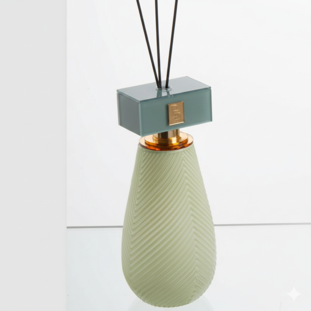 Il tappo รจ un elemento di design a sรฉ stante: una finitura dorata brillante si fonde armoniosamente con un blocco cubico in vetro color verde acqua opaco, che richiama le sfumature serene della natura. Al centro, un’elegante applicazione dorata con il logo Buba Design sigilla l’autenticitร  e la lussuosa artigianalitร  del prodotto. Dalla parte superiore, le sottili bacchette nere diffondono la tua fragranza preferita in modo continuo e delicato, riempiendo la stanza di un aroma avvolgente.