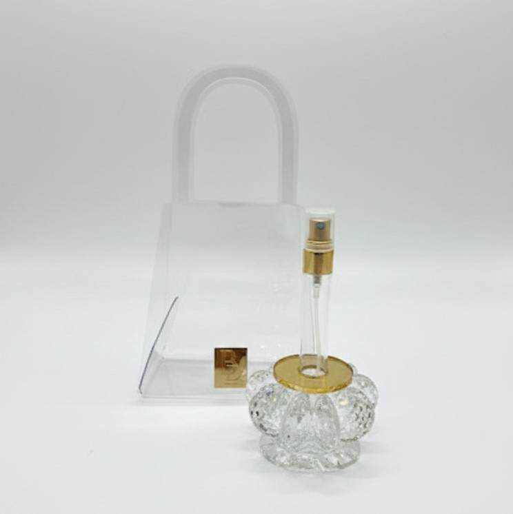 Packaging,Flacone in vetro con dettagli oro e borsa trasparente inclusa