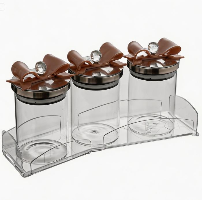 Base in Plexiglass Trasparente: Il set include un vassoio sagomato in plexiglass che mantiene i barattoli ordinati e pronti all’uso, donando un senso di leggerezza visiva.