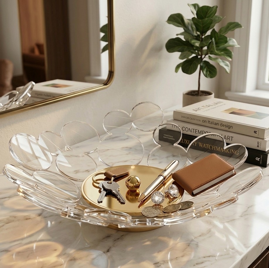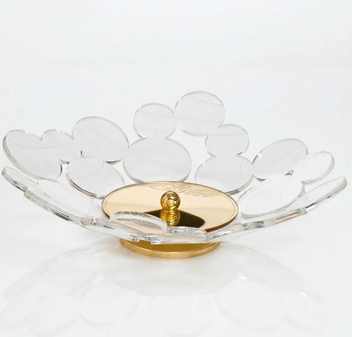 Caratterizzato da una struttura a “petali” o “nuvole” in acrilico trasparente di altissima qualità, questo svuota tasche incanta per la sua leggerezza visiva. Ogni elemento è sagomato con precisione laser e impreziosito da sottili incisioni che creano un raffinato gioco di luci sulla superficie.
