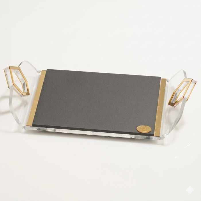 Lo svuota tasche si distingue per la sua base in finitura nero opaco (Noir), che conferisce un aspetto materico e profondo, perfetto per far risaltare gli oggetti che ospita. La struttura in acrilico trasparente di alto spessore crea un effetto cornice che sembra far fluttuare la base scura.