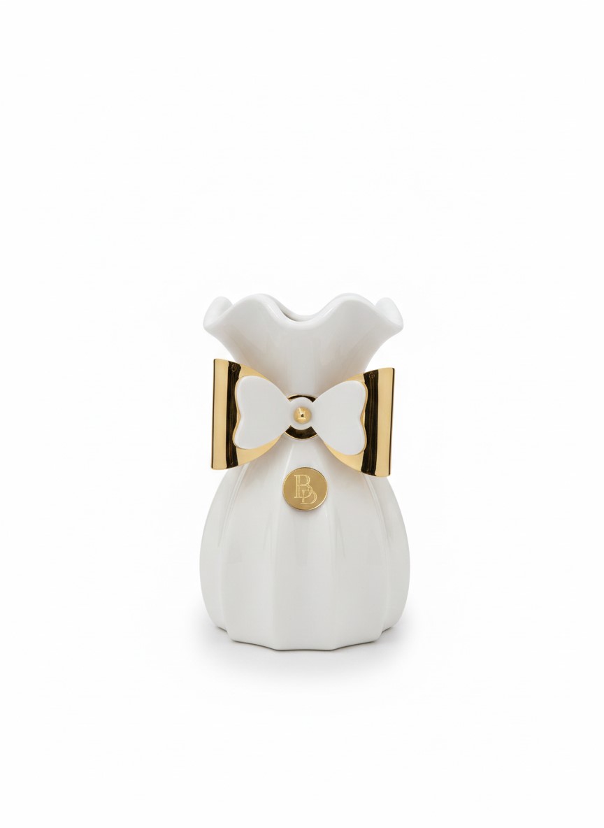 Il Fiocco Iconico: Il vero protagonista รจ l’elegante fiocco applicato, realizzato con una combinazione di ceramica bianca e preziosi profili in oro lucido che catturano la luce.