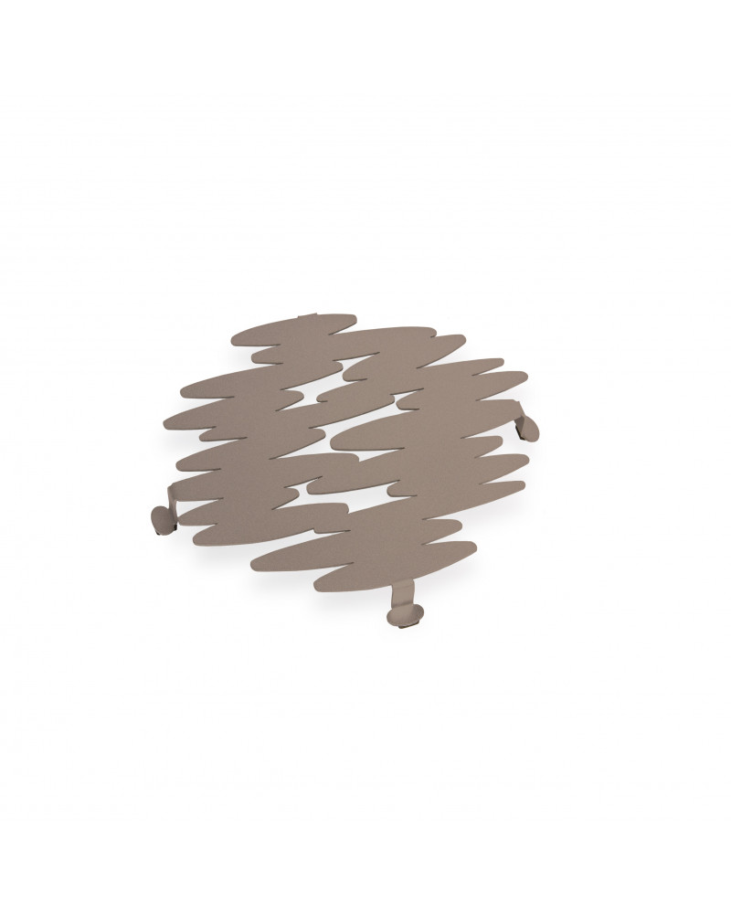 Sottopentola design in metallo (acciaio dolce) realizzato mediante taglio laser ricavandone una forma che ricorda uno schizzo fatto a matita. Il diametro di questo sottopentola moderno รจ pari a 20 cm.