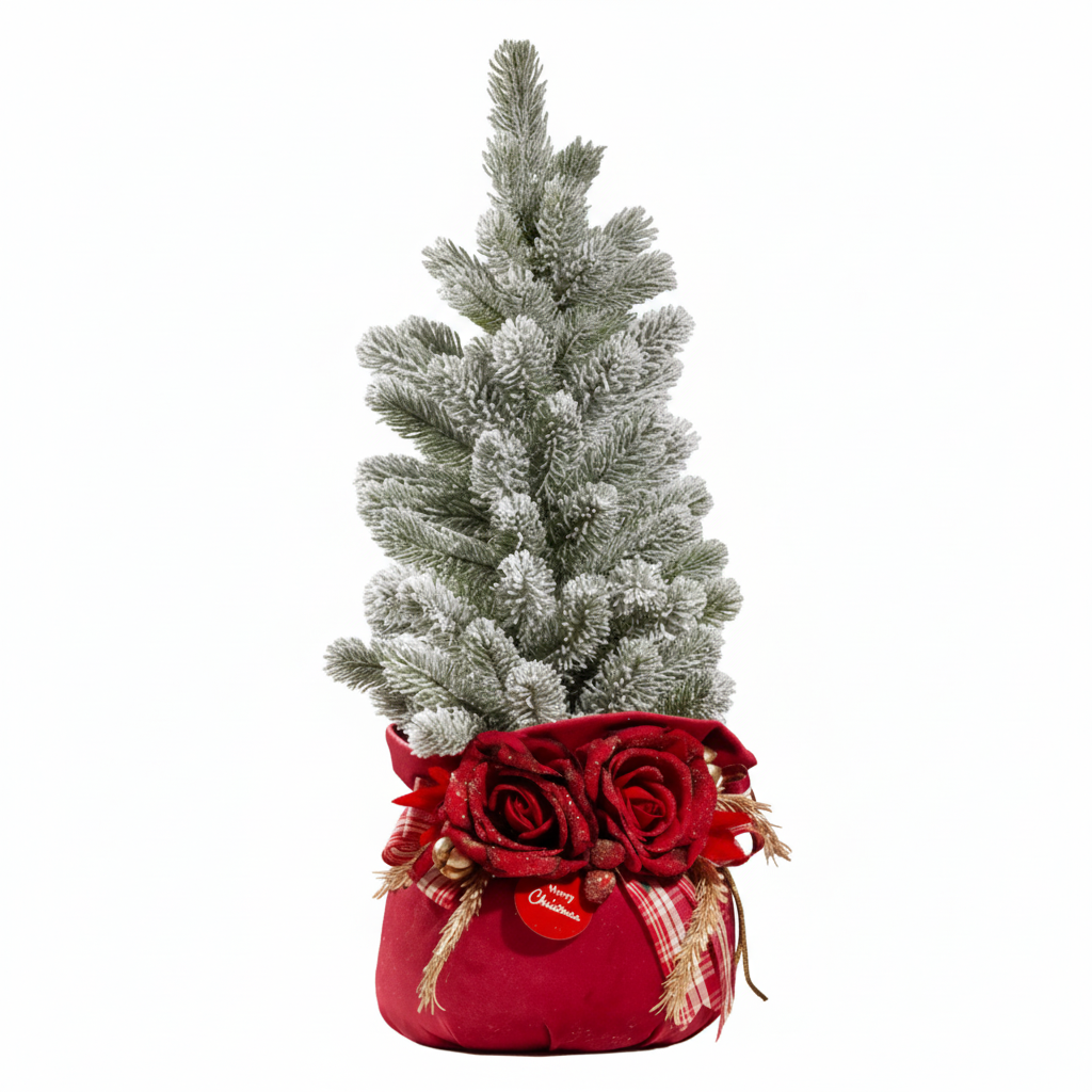 Illumina il tuo ambiente con il fascino natalizio di questo delizioso alberello innevato di Cherry and Peach. Perfetto per decorare scrivanie, mensole o piccoli angoli, questo alberello รจ adagiato in un’elegante base in tessuto rosso, impreziosita da due rose rosse scintillanti, dettagli dorati e un allegro fiocco scozzese con l’etichetta ‘Merry Christmas’. Un tocco di magia invernale in miniatura, ideale per creare un’atmosfera festiva in ogni stanza.