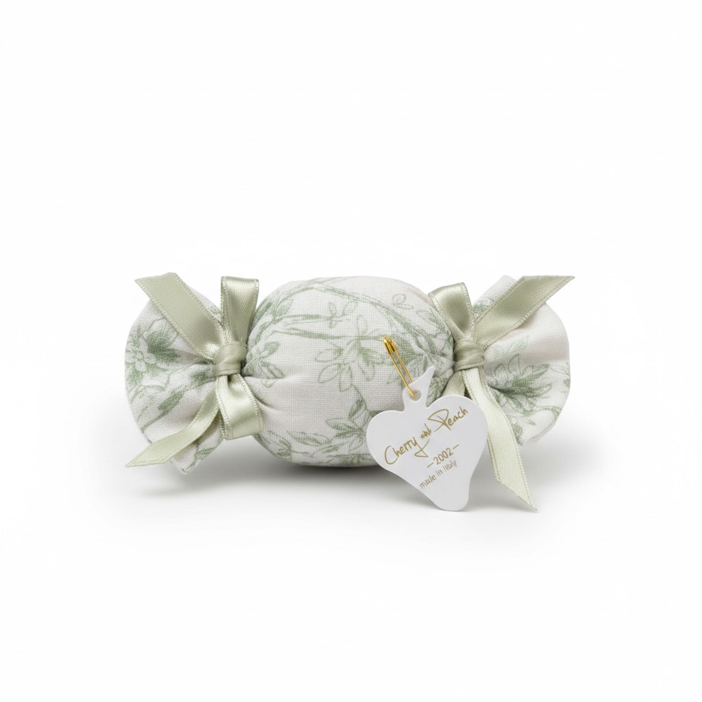 Puro Lino e Motivi Botanici: La caramella รจ realizzata in pregiato lino, decorato con una delicata stampa floreale “Toile de Jouy” nei toni del verde salvia su fondo avorio, evocando la serenitร di un giardino segreto.