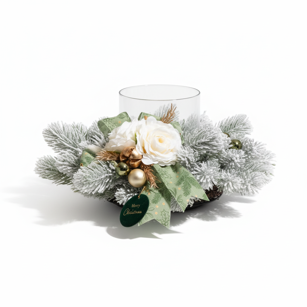 Ghirlanda Innevata e Fiori Candida: Intorno al portacandela in vetro, una ghirlanda di rami di abete finemente innevati evoca la serenitร di un paesaggio invernale. Tra il bianco candido delle “neve” e il verde tenue degli aghi, sbocciano raffinate rose bianche artificiali, simbolo di purezza ed eleganza senza tempo.