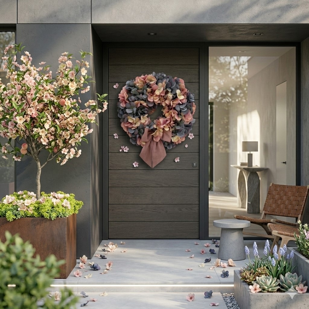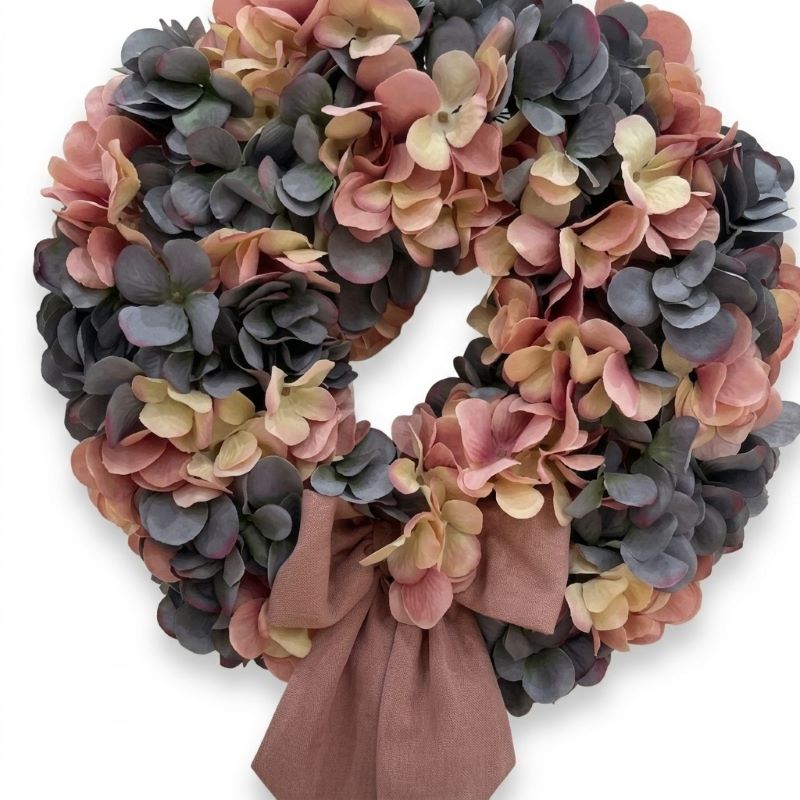La corona si distingue per l’uso scenografico di morbide ortensie in tessuto, scelte in una palette cromatica sofisticata e moderna. Il contrasto armonioso tra i petali pesca rosato e le sfumature grigio polvere/lavanda scura crea un movimento visivo unico, ideale per integrarsi sia in ambienti classici che contemporanei.