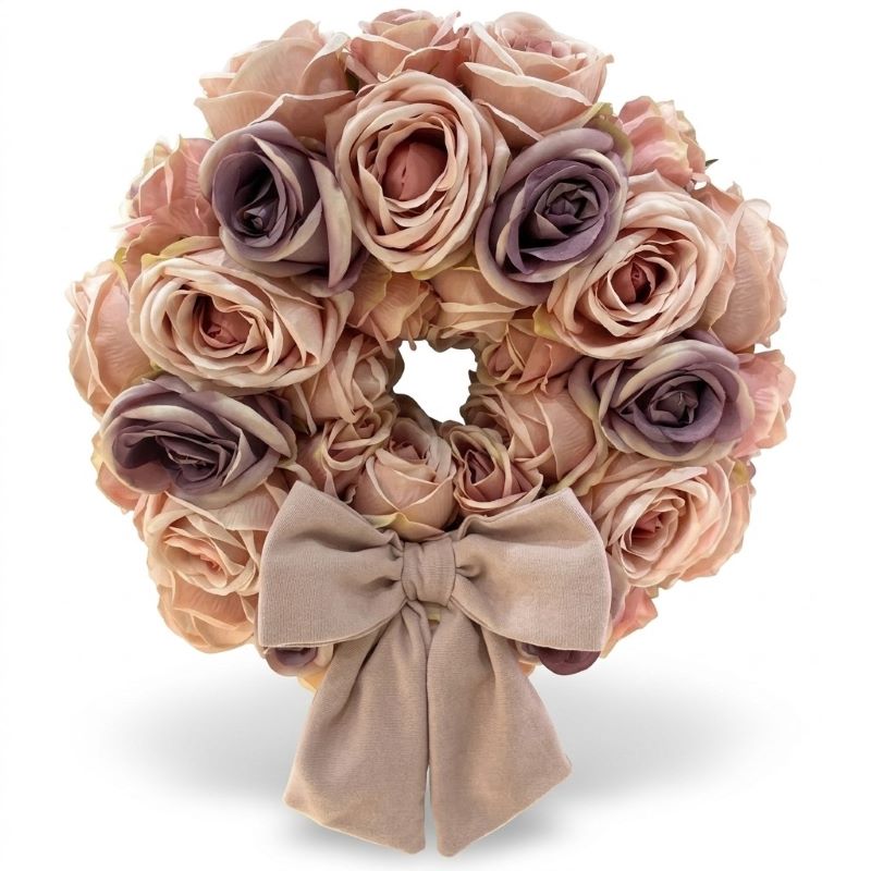 La ghirlanda si distingue per una composizione ricca e armoniosa di rose in tessuto di altissima qualità. La palette cromatica gioca su delicate sfumature di rosa cipria, pesca e tocchi di malva polveroso, creando un effetto visivo profondo e sofisticato.