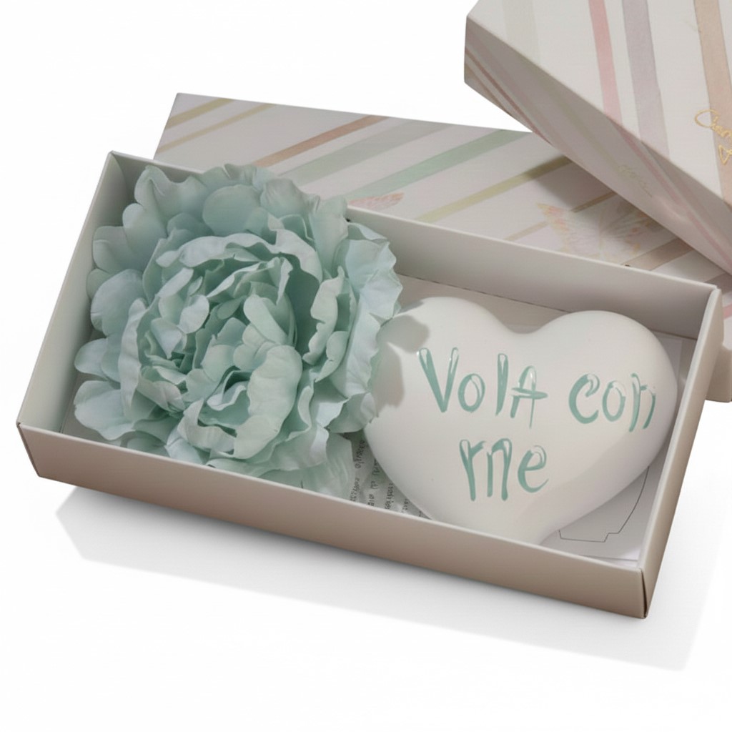 Il Cuore: Una scultura in ceramica bianca dalla finitura setosa, impreziosita dal messaggio calligrafico “Vola con me”. Un invito al sogno e alla libertà, dipinto in una raffinata tonalità verde salvia.