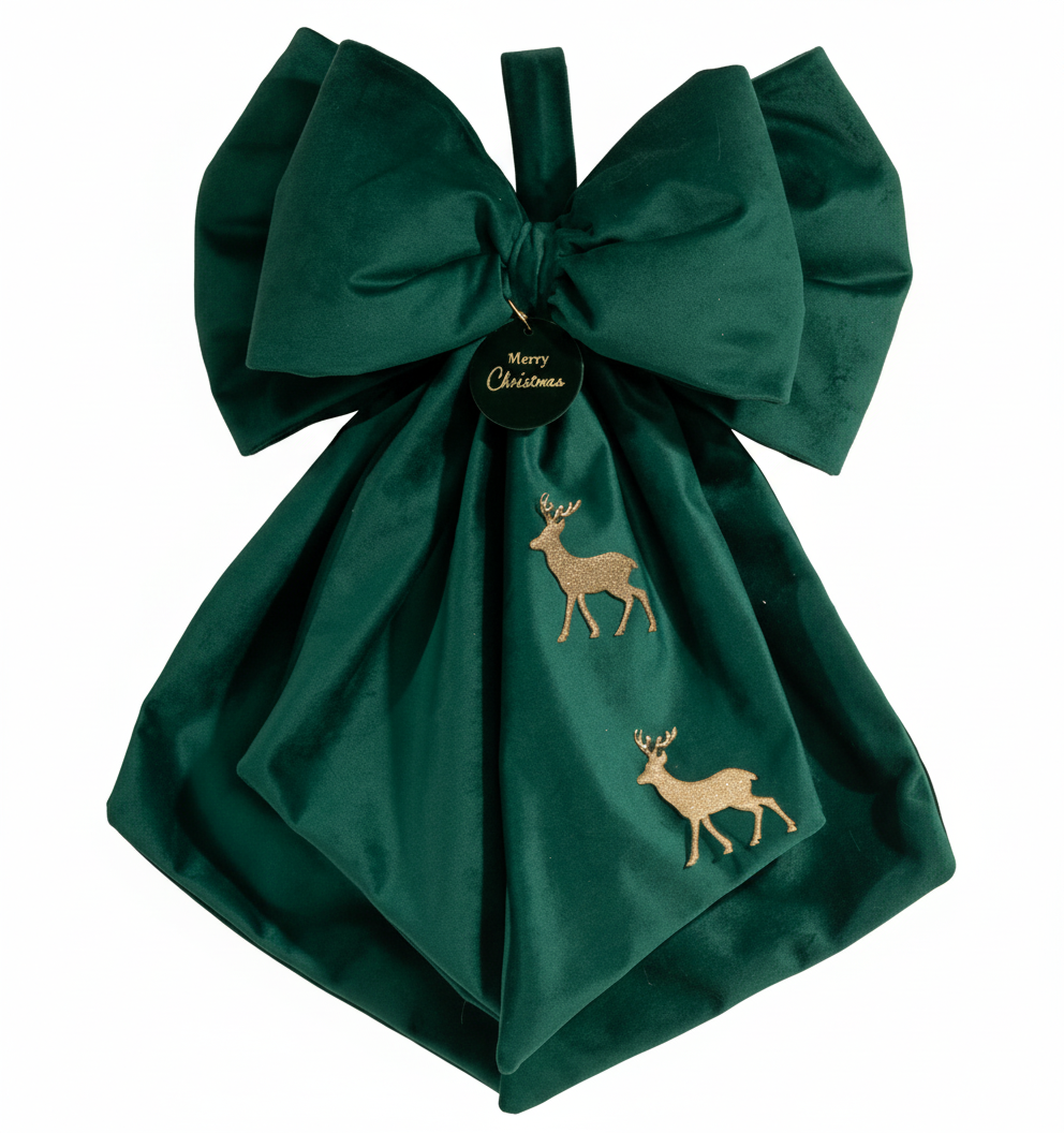 Perfetto come ornamento fuori porta o come elemento centrale per l’albero di Natale, il fiocco si distingue per la sua forma generosa e le sue ricche pieghe. Il vero punto di forza sono le due silhouette dorate di renne, finemente ricamate, che aggiungono un bagliore festivo e un richiamo alla magia del Natale.