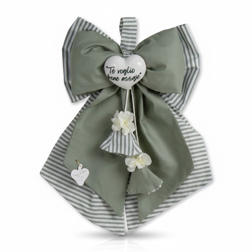Il Cuore del Messaggio: Al centro del fiocco splende un cuore in ceramica bianca, decorato con la tenera dedica in corsivo: “Te voglio bene assaje”, un omaggio alla tradizione e al calore del sentimento.