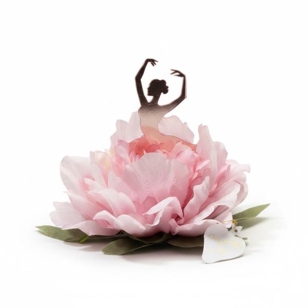 Dettaglio Artistico Esclusivo: Al centro del fiore emerge una delicata sagoma metallica di ballerina in finitura oro rosa, che aggiunge un tocco di grazia eterea e movimento alla composizione.