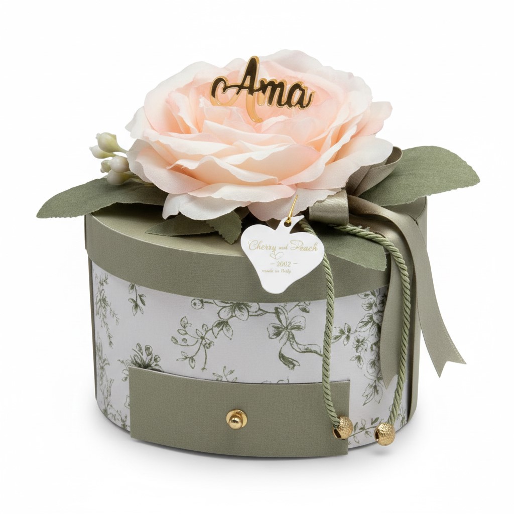 Scopri il fascino di un regalo che incanta prima ancora di essere svelato. La Scatola a Cassetto di Cherry and Peach รจ un piccolo capolavoro di design cartotecnico e floreale, dove la funzionalitร di uno scrigno incontra la bellezza eterna di una fioritura artigianale.