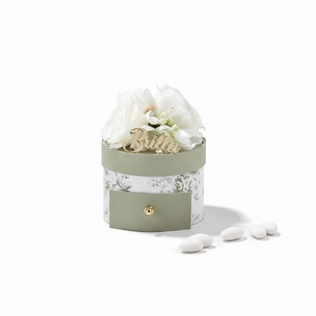 Struttura a Cassetto Raffinata: La scatola presenta un’elegante base cilindrica con una raffinata stampa floreale toile de jouy nei toni del verde salvia e bianco. Il pratico cassetto frontale, rifinito con un pomello dorato, aggiunge un tocco di funzionalitร e stile retrรฒ.