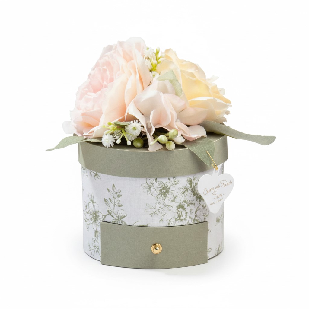 Scopri il fascino di un regalo che incanta prima ancora di essere svelato. La Scatola a Cassetto di Cherry and Peach รจ un piccolo capolavoro di design cartotecnico e floreale, dove la funzionalitร  di uno scrigno incontra la bellezza eterna di una fioritura artigianale.