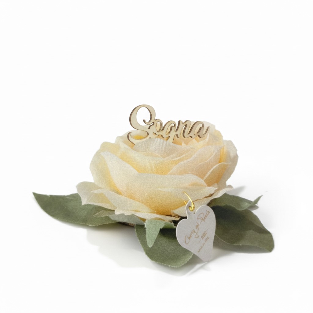 La Rosa Peach: Protagonista del segnaposto รจ una splendida rosa in tessuto nei toni delicati del pesca e crema, realizzata con petali soffici e sfumati che riproducono la naturalezza di un fiore appena sbocciato.