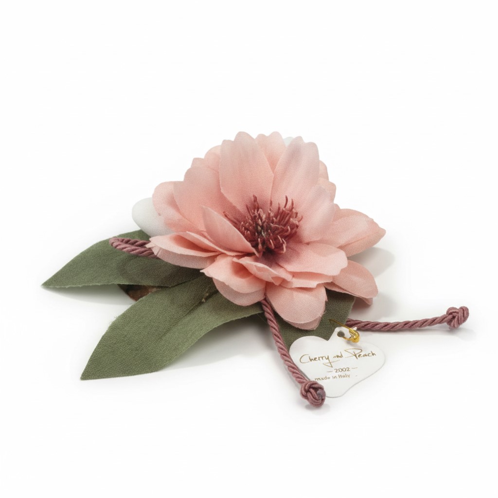 Splendore Floreale: Protagonista assoluta è una rigogliosa camelia in tessuto color rosa antico, i cui petali vellutati sfumano dolcemente verso il centro, creando un punto luce romantico e sofisticato.