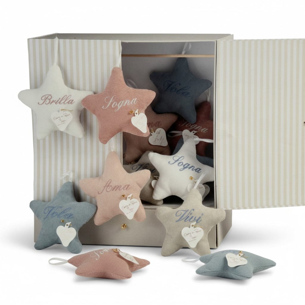 Auguri Ricamati: Il cuore della stella ospita un’emozione ricamata in filato lucido coordinato. Parole come “Sogna”, “Vivi”, “Ama”, “Brilla” e “Vola” trasformano l’oggetto in un messaggio profondo e personale.