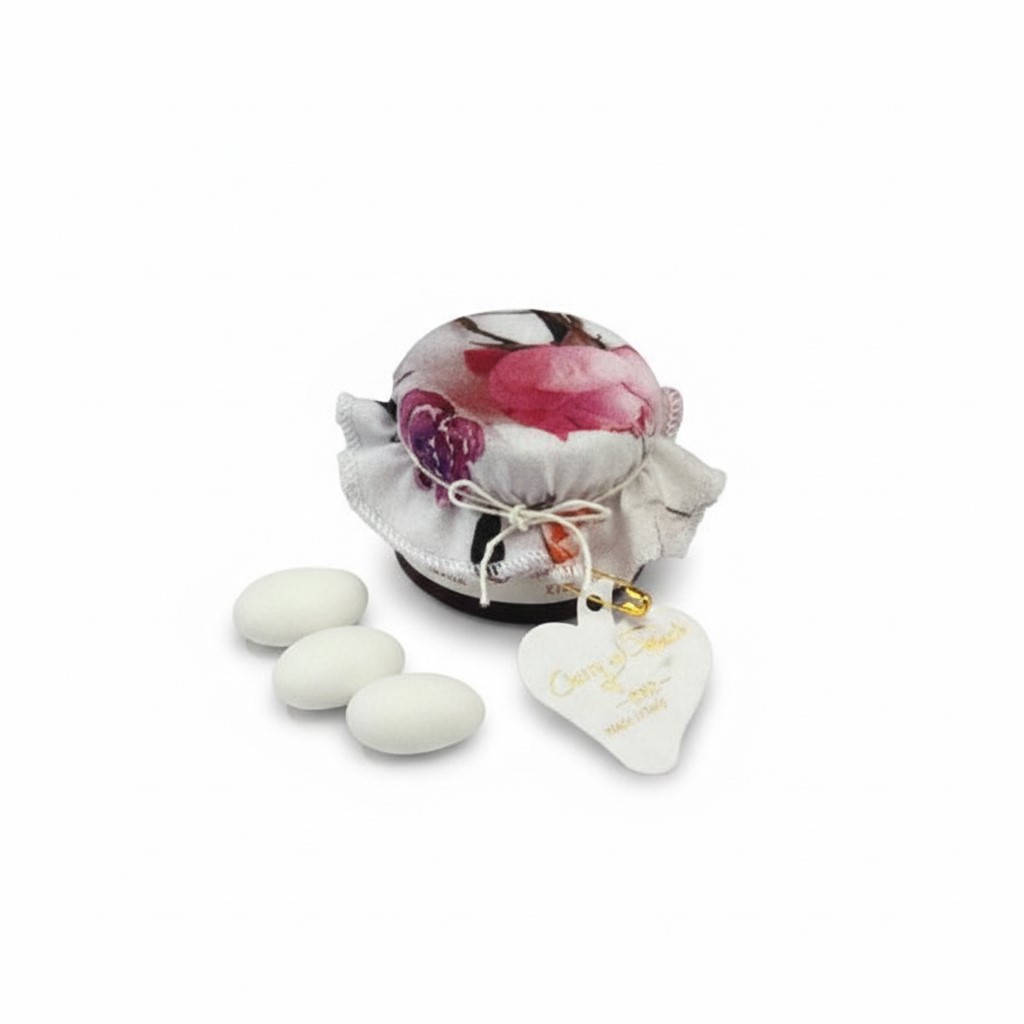 Design Raffinato: Il vasetto รจ impreziosito da un copritappo in tessuto con una delicata stampa floreale dai toni rosa e fucsia, rifinito con un fiocco in cordino e un’elegante etichetta a forma di cuore con logo dorato.