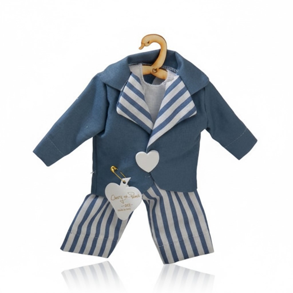 Accessori Miniaturizzati: Curato in ogni minimo particolare, il vestitino include una piccola gruccia in legno sagomata per essere appesa con facilità e un bottoncino centrale a forma di cuore bianco.