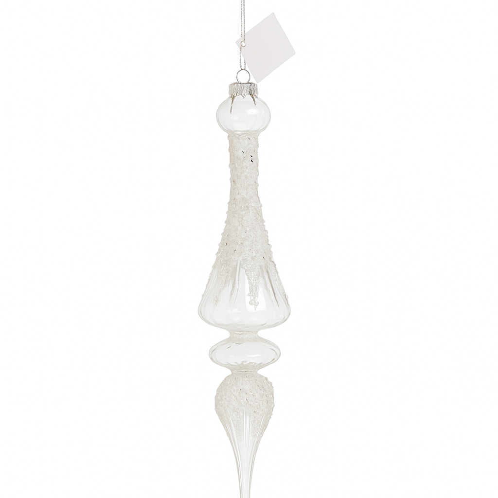 Realizzato in vetro soffiato trasparente, presenta linee sinuose e dettagli delicati che catturano la luce creando suggestivi riflessi. La lavorazione con effetto ghiaccio lo rende un elemento elegante e sofisticato, perfetto per decorazioni natalizie chic e senza tempo.