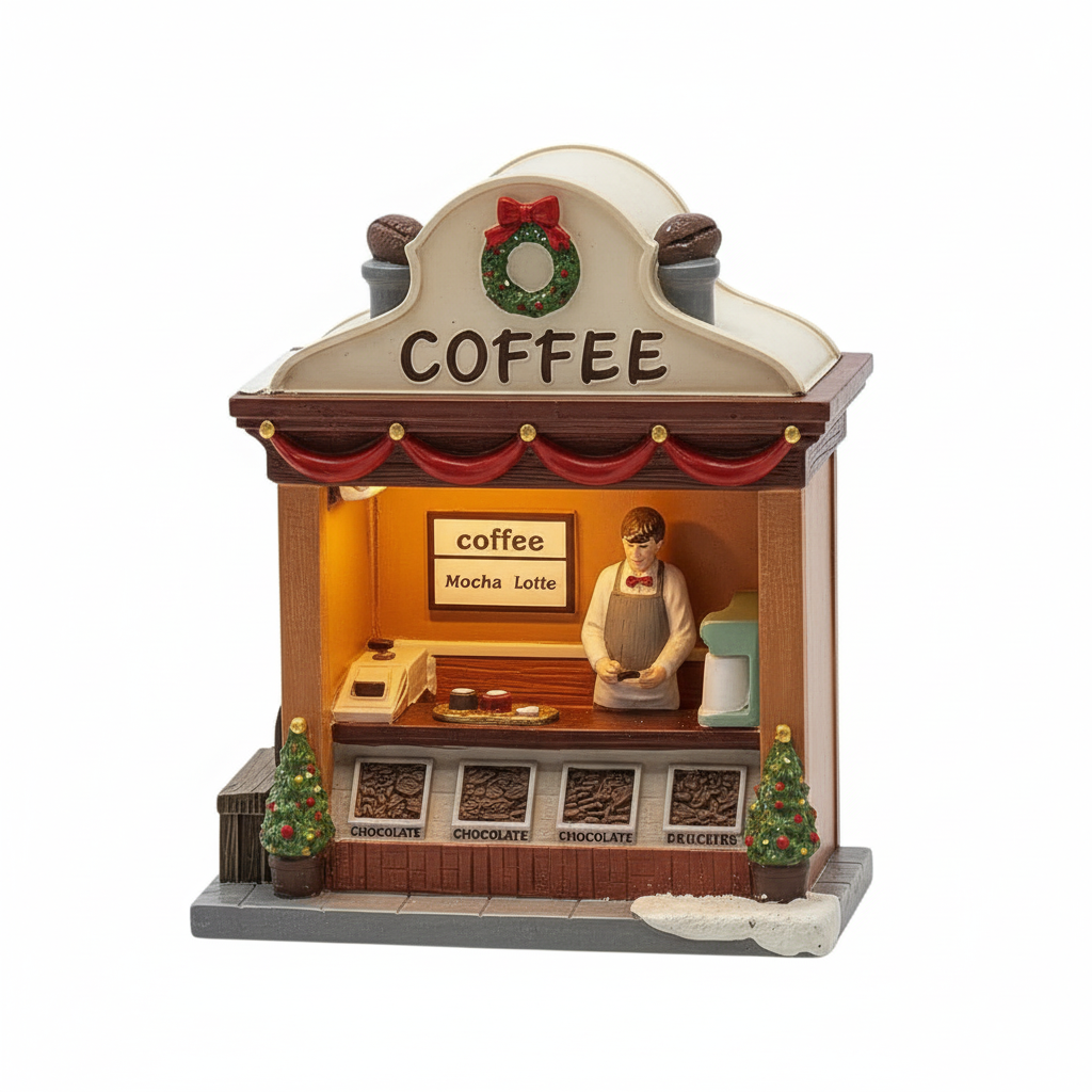Il Coffee Stand Accogliente: Immagina il profumo del caffรจ appena fatto e del Mocha Latte che si diffonde nell’aria fredda. Il nostro stand del caffรจ, completo di un barista sorridente e dettagli cioccolatosi, รจ il luogo ideale per una pausa calda e confortante.Ogni mini-stand รจ realizzato con cura, illuminato con luci calde che creano un’atmosfera magica, e presenta dettagli che ti trasporteranno direttamente in un pittoresco mercatino di Natale. Sono il regalo perfetto per collezionisti, amanti del Natale o chiunque voglia aggiungere un tocco speciale alla propria decorazione festiva.