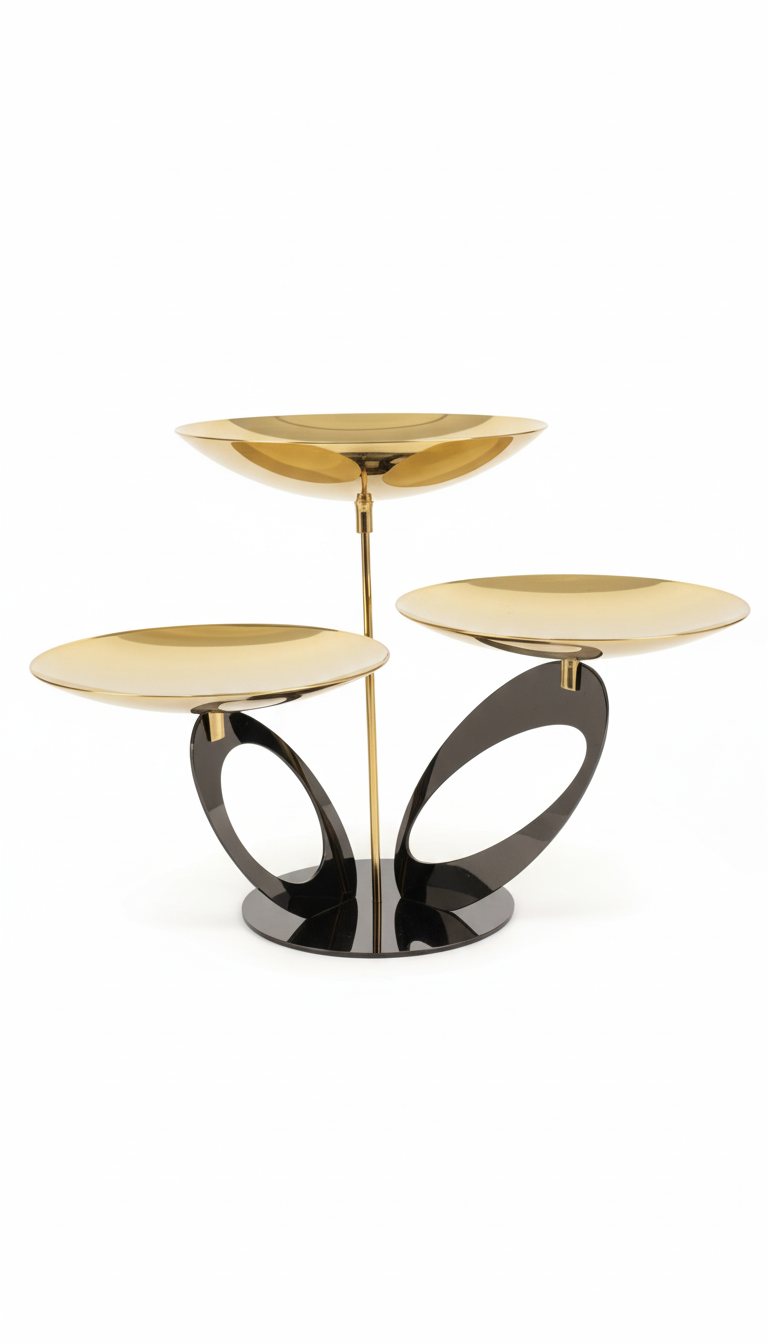 Introduci un tocco di lusso e raffinatezza in ogni ambiente con la nostra esclusiva alzata centrotavola a tre piatti “Armonia Dorata”. Progettata per stupire e servire con stile, quest’opera d’arte funzionale cattura lo sguardo e incanta i sensi.