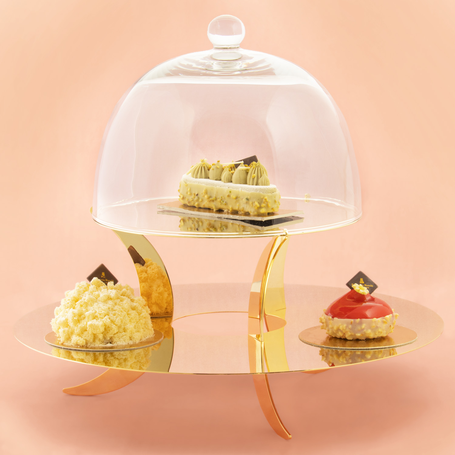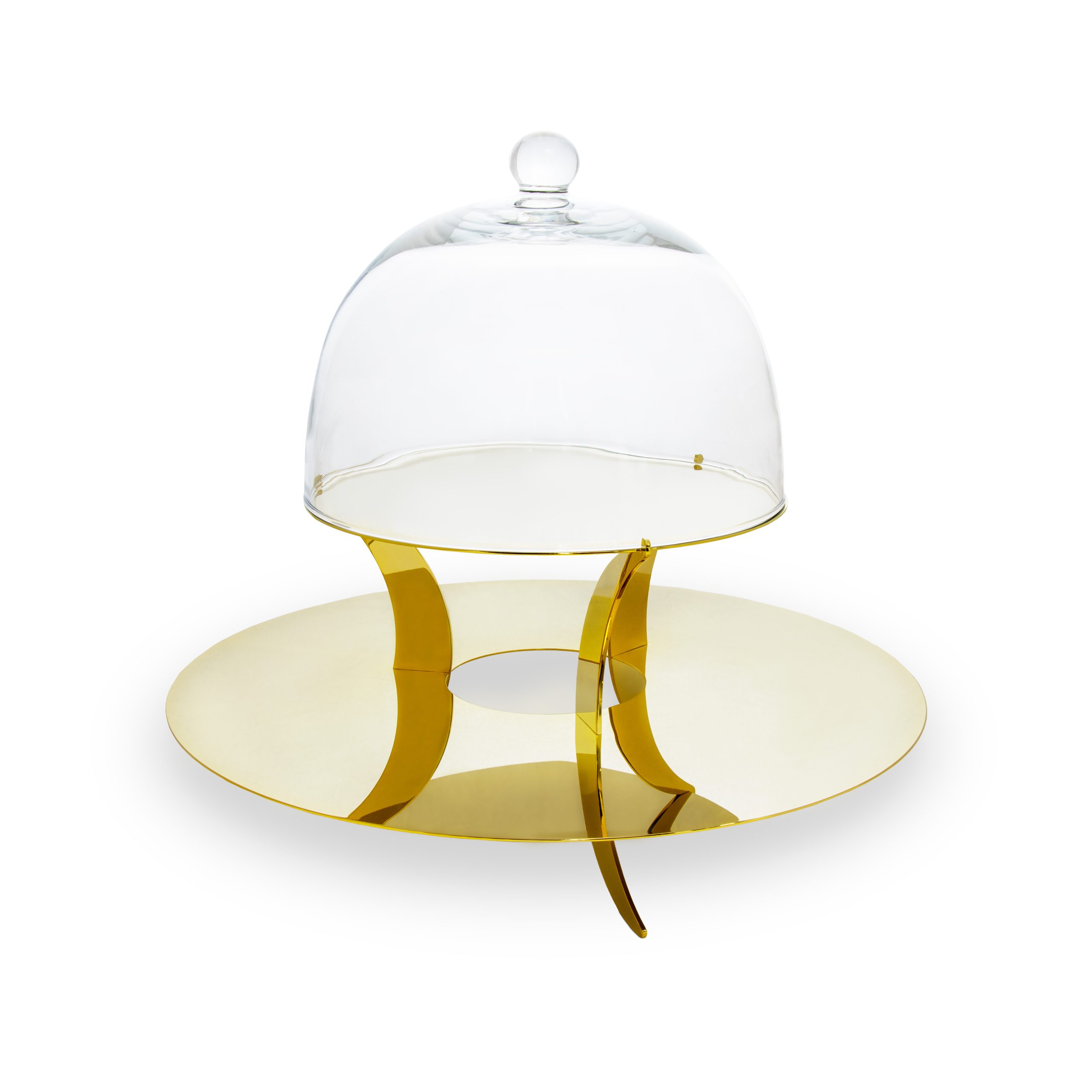 La base dorata, con le sue curve sinuose e la finitura brillante, crea un palcoscenico di pura raffinatezza, mentre la cupola in vetro trasparente permette di ammirare la bellezza dei tuoi dessert, formaggi o antipasti, mantenendone intatti freschezza e aroma. L’incontro tra l’oro splendente e la trasparenza cristallina offre un contrasto visivo accattivante, elevando ogni tavola.
