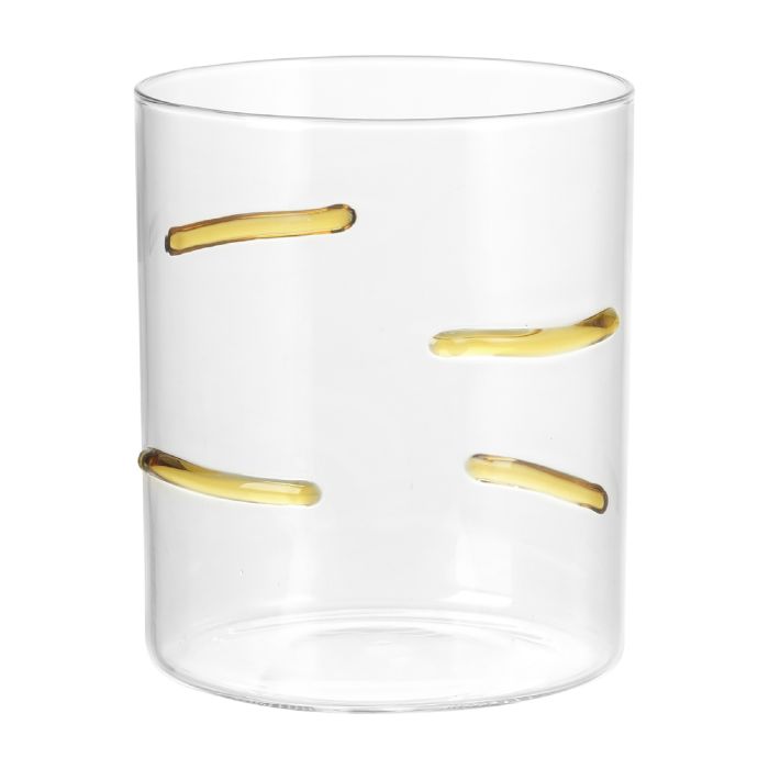 Set 4 tumbler in vetro borosilicato trasparente con dettagli ambrati per donare carattere e vivacità alla tua tavola, si abbina perfettamente con qualsiasi altro set. Lavabile in lavastoviglie.