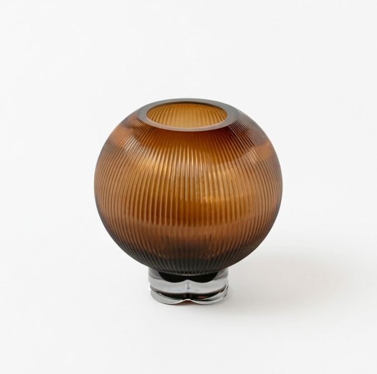 Questo vaso si distingue per il suo corpo globulare in vetro ambrato/fumè, interamente percorso da una fitta trama di scanalature verticali (rigato). Questa particolare lavorazione non solo conferisce un ritmo visivo dinamico, ma gioca con la rifrazione della luce, creando un effetto satinato e vibrante che cambia a seconda dell’angolazione. La base trasparente a contrasto dona un senso di leggerezza, facendo apparire la sfera quasi sospesa.
