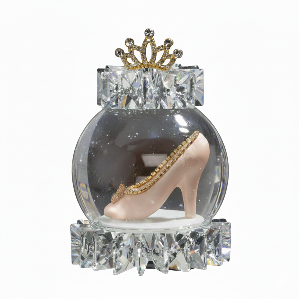La Scarpetta Sospesa: Al centro della sfera trasparente, una delicata scarpetta col tacco color cipria o rosa antico è impreziosita da dettagli in strass dorati, evocando l’iconica scarpetta di Cenerentola o un prezioso cimelio da sposa.