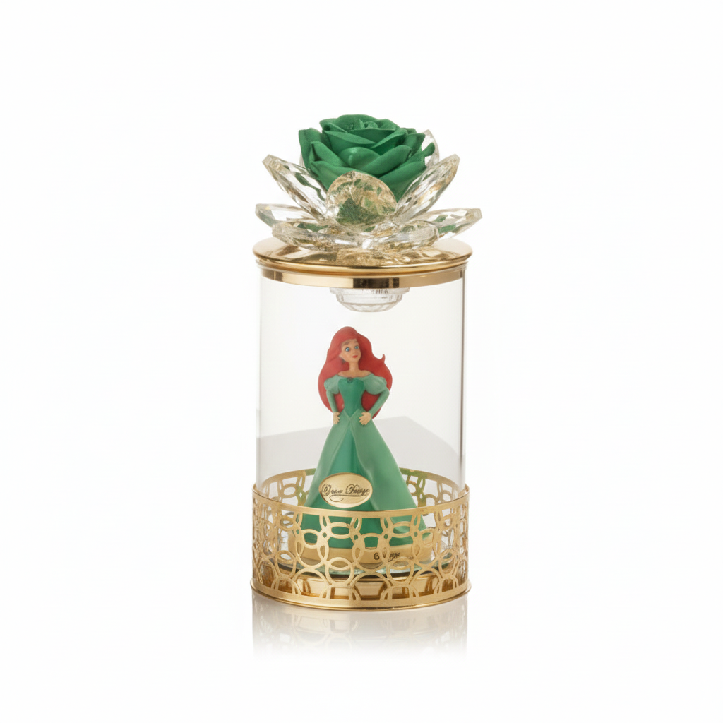 Principessa Ariel in una lampada cilindro di vetro con luce LED; Al suo interno troverete il telecomando. Disponibilitร di averla con cenerentola, ariel o la belle con filigrana a scelta fra oro o argento, e con fiore abbinato sull’estremitร .