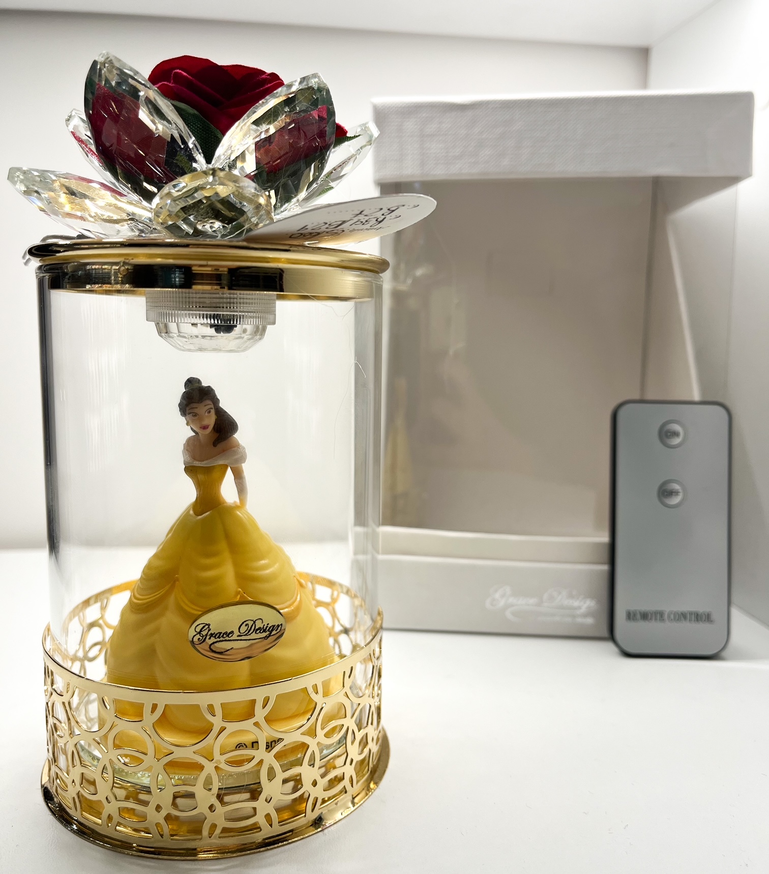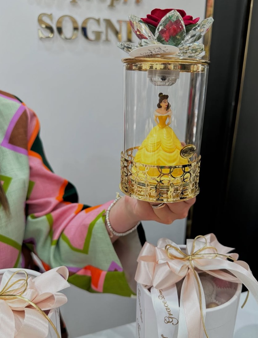 Principessa Belle in una lampada cilindro di vetro con luce LED; Al suo interno troverete il telecomando. Disponibilitร  di averla con cenerentola, ariel o la belle con filigrana a scelta fra oro o argento, e con fiore abbinato sull’estremitร .
