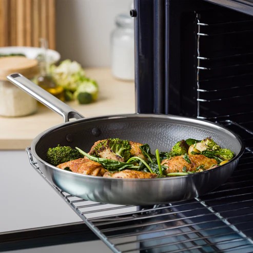 Questa padella ibrida unisce la robustezza dell’acciaio inossidabile a triplo strato alla praticità di un rivestimento antiaderente. È perfetta per scottare una bistecca ad alte temperature, senza che si attacchi o bruci.