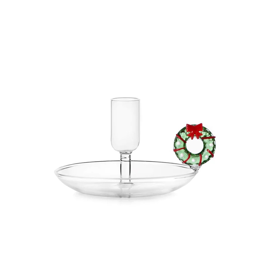 Il corpo trasparente ed essenziale è impreziosito da una deliziosa miniatura in vetro colorato: una perfetta ghirlanda natalizia con fiocco rosso, simbolo di festa, accoglienza e calore familiare. Ogni dettaglio è modellato con cura artigianale, in un perfetto equilibrio tra funzionalità ed estetica.
