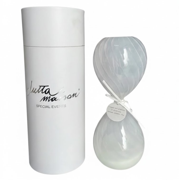 Elegante clessidra in vetro soffiato bianco, sintesi perfetta tra design contemporaneo e artigianalità. La silhouette è esaltata da una lavorazione a spirale che cattura la luce, creando riflessi delicati e dinamici. Un raffinato nastrino in pelle bianca ne sottolinea il profilo, aggiungendo un tocco materico e chic.