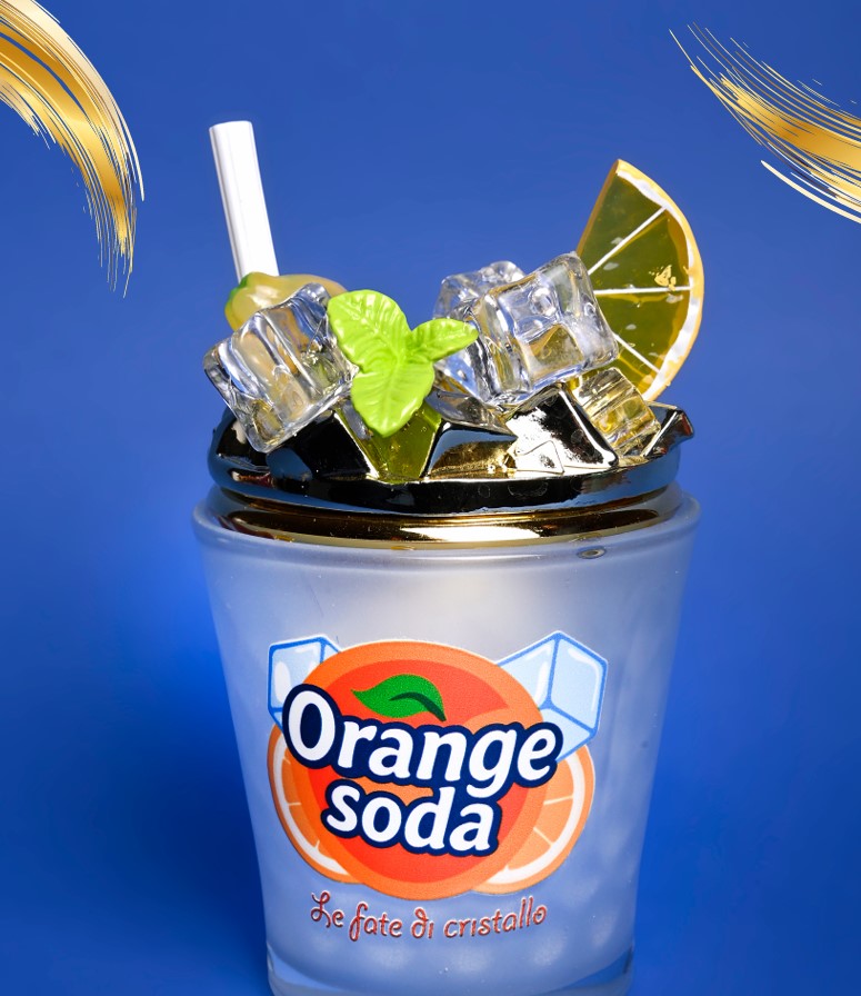 Look Ghiacciato e Pop: La base รจ un bicchiere effetto vetro smerigliato (frosted), perfetto per ricreare la sensazione di una bibita ghiacciata. L’iconico logo “Orange Soda” in arancione vivace cattura immediatamente l’occhio.