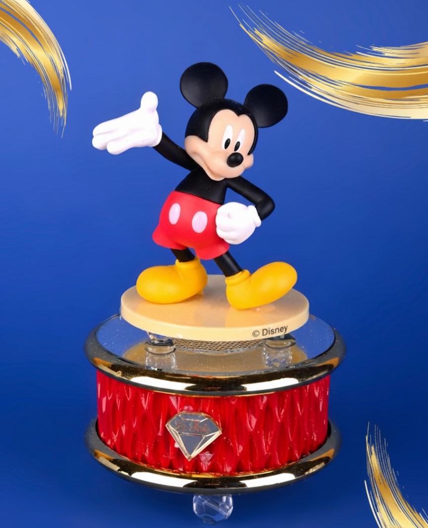 Topolino in Primo Piano: Sulla sommità della cassa troneggia una statuetta dinamica di Topolino nel suo classico outfit rosso e nero, pronto a dare il ritmo.