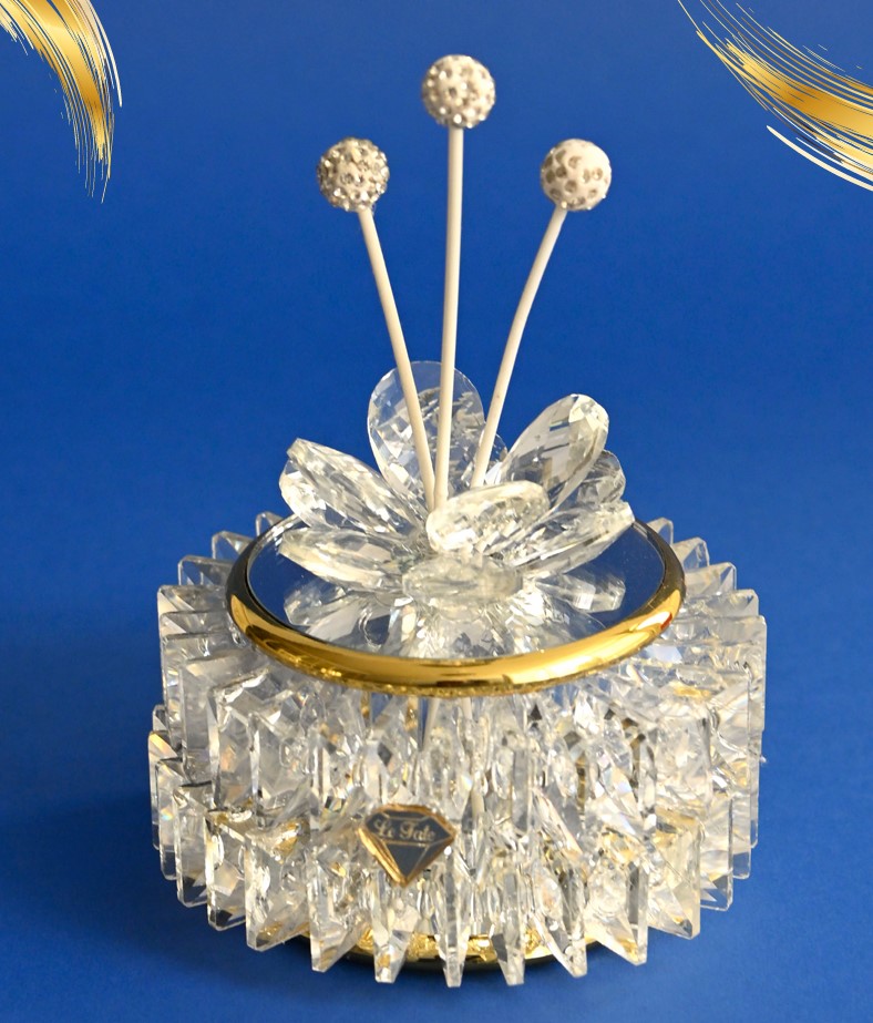 Topper Floreale: Il coperchio รจ decorato con un fiore di cristallo sfaccettato, simbolo di purezza ed eleganza.