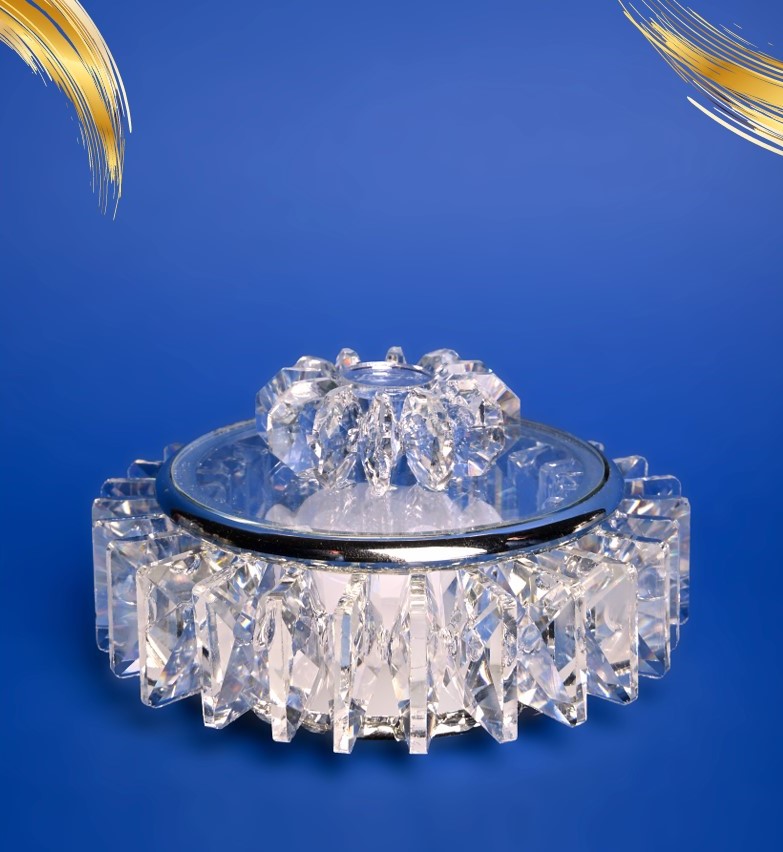 Design a 360ยฐ: Il corpo รจ interamente rivestito da sfaccettature geometriche effetto cristallo, catturando la luce da ogni angolazione e creando un brillante gioco di riflessi.