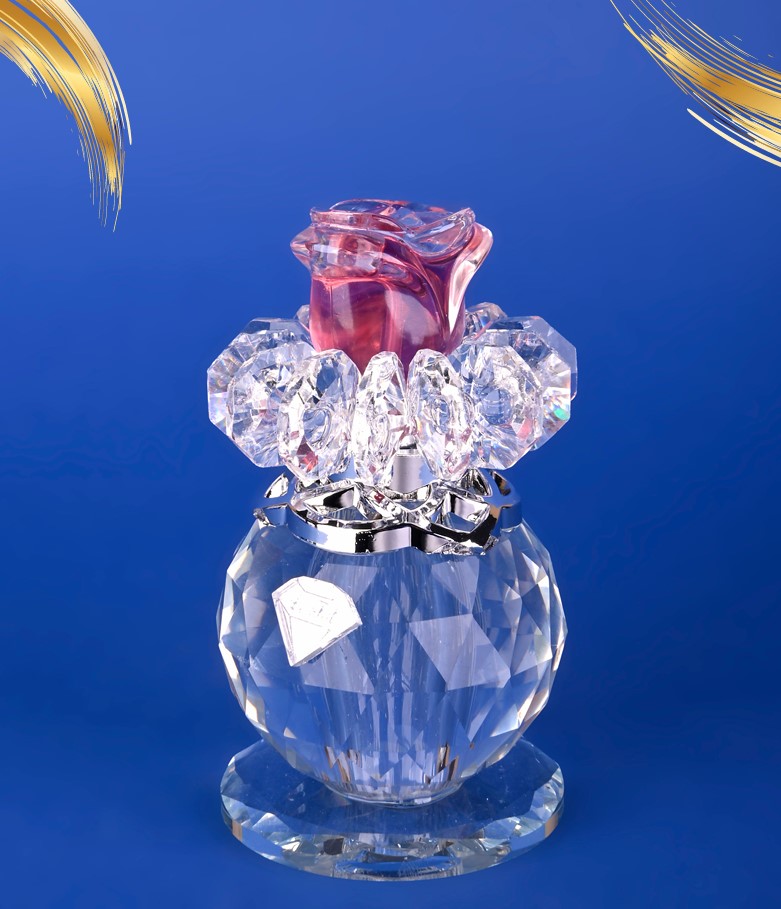Il Bocciolo Eterno: Il tappo รจ una magnifica rosa in cristallo rosa sfumato, che simboleggia amore e bellezza, racchiudendo il prezioso contenuto con un tocco romantico.