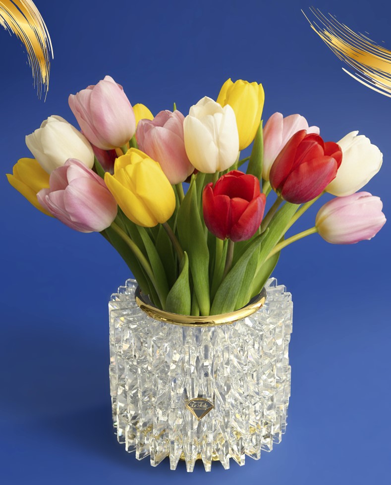 Contrasto Luminoso: La trasparenza assoluta del cristallo esalta i colori vivaci dei fiori (come i bellissimi tulipani in foto), mentre il design esterno aggiunge un elemento di struttura e maestosità.